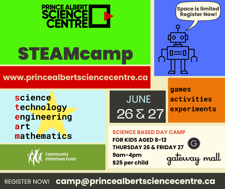The camp is running the week of July 15th-19th at Prince Albert Science Centre in the Gateway Mall. All information and registration found here.